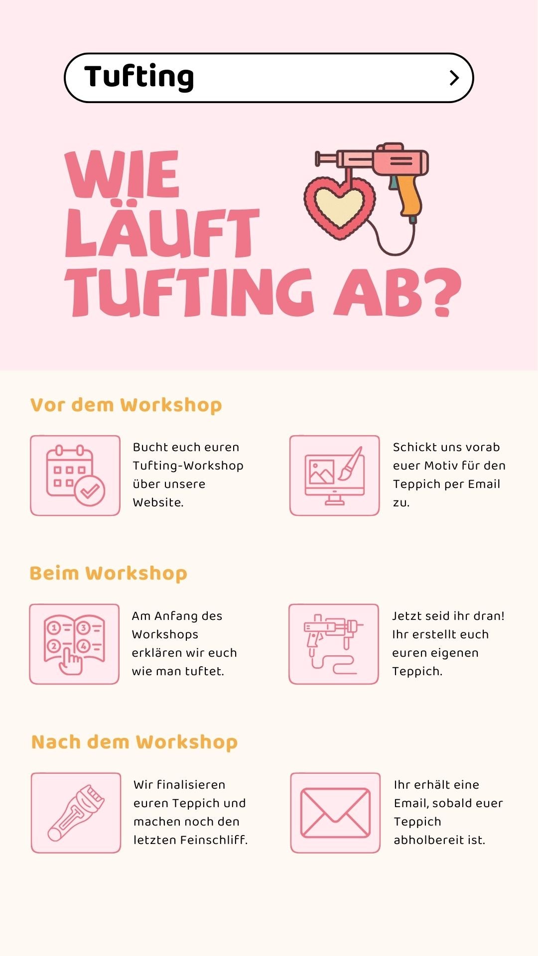 Das ist kein Problem. Unsere Workshops sind für alle geeignet. Wir erklären zu Beginn stets, wie man die Tufting-Gun verwendet und unterstützen euch gern, wenn ihr Fragen habt.