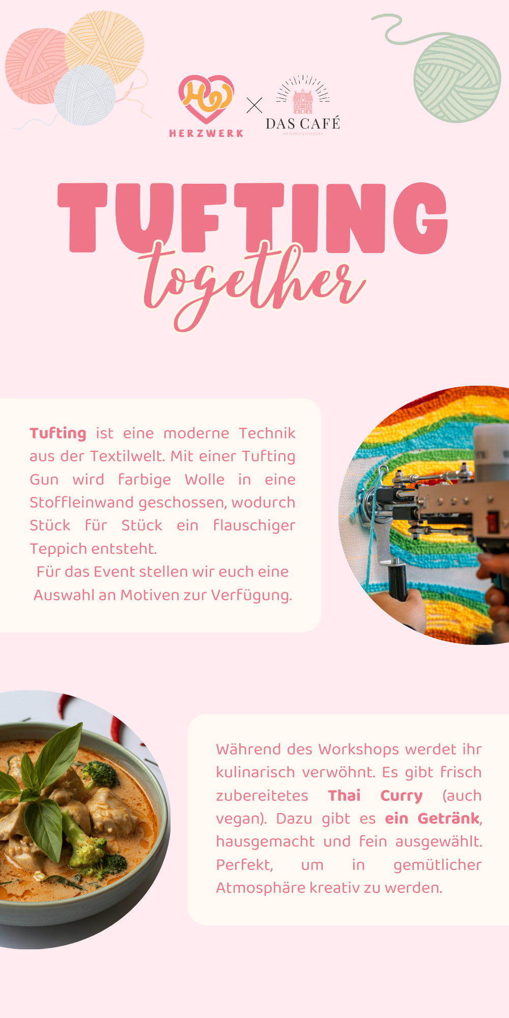 Während des Events erklären wir euch Schritt für Schritt, wie das Tuften funktioniert. Ihr benötigt keinerlei Vorkenntnisse oder eigenes Material. Alles wird von uns bereitgestellt. Wir führen euch durch den Ablauf, legen gemeinsame Essenpausen ein und sorgen dafür, dass ihr euren Teppich entspannt anfertigen könnt.