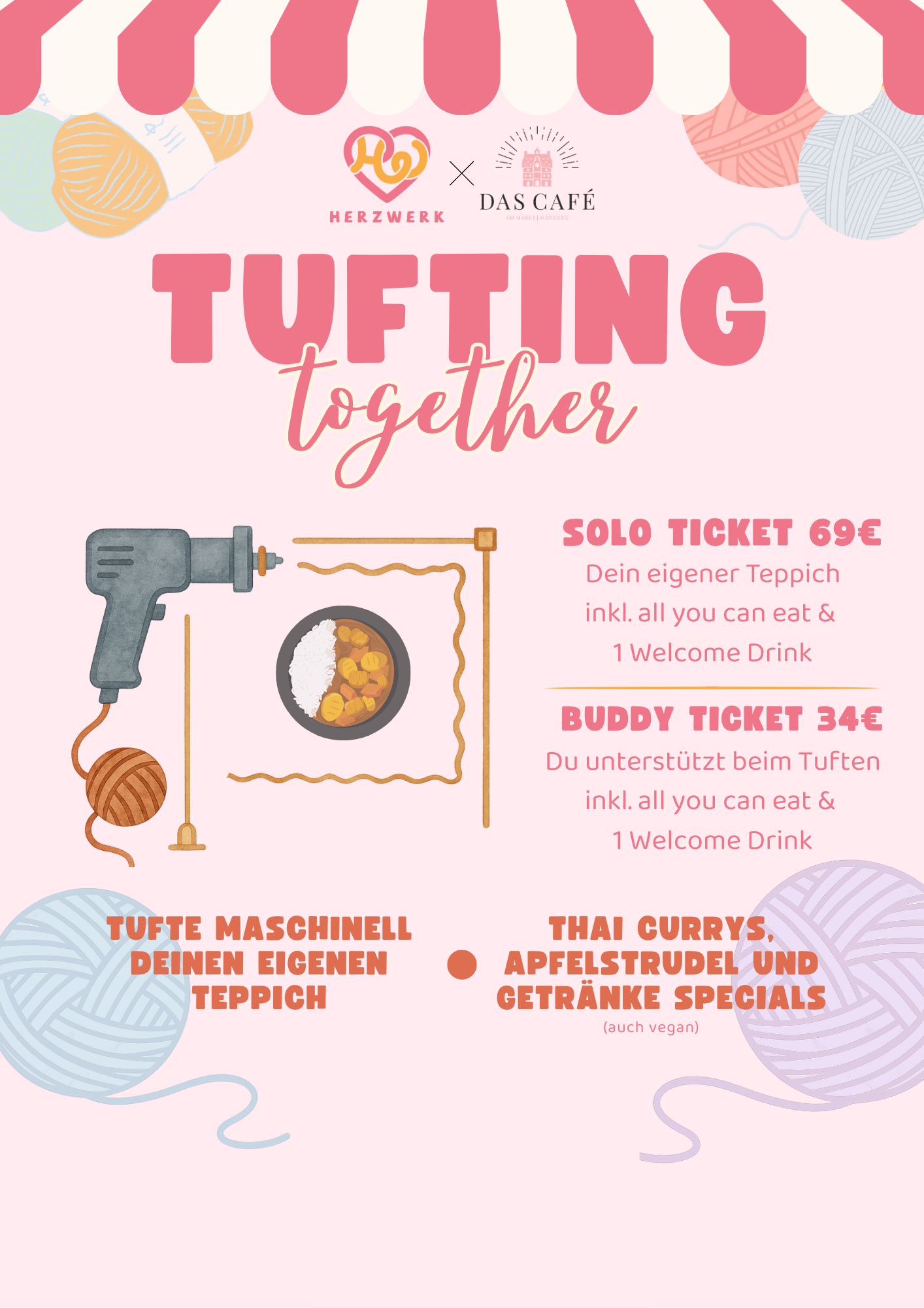 Das Solo-Ticket beinhaltet euren eigenen Teppich sowie All You Can Eat inklusive 1 Welcome Drink. Das Buddy-Ticket richtet sich an alle, die jemanden beim Tuften unterstützen möchten, ebenfalls inklusive All You Can Eat und 1 Welcome Drink. Dadurch könnt ihr auch zu zweit oder in einer Gruppe gemeinsam an einem Motiv arbeiten.